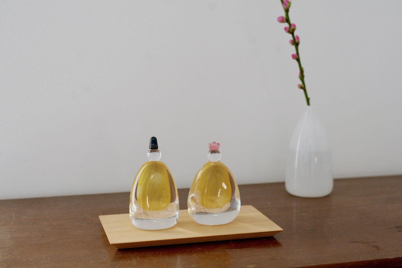 「ひとつひとつ手作りで作られているガラス素材のお雛様です。デザインのシンプルさも去ることながら、杉台の上に飾ることで趣を感じられる逸品。豪華なお飾りなどはありませんが、ひと目見てお雛様だとわかりますし、まるでアートのような、とても目を惹くデザインが素敵ですよね。