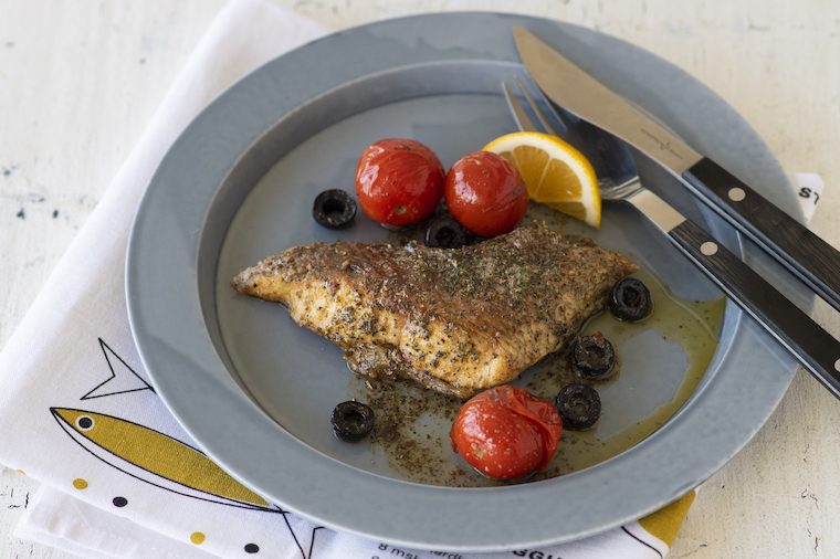 3. 2のフライパンに、半分に切った種なしブラックオリーブとプチトマトを加え、1分ほど煮る。フライパンの中のバターソースと具を、2の皿に盛り付け、レモンを添える。