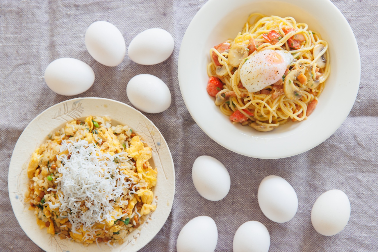 では、さっそく卵を使った栄養たっぷりなレシピを教えていただきましょう。今回教えていただくのは「半熟卵のカルボナーラ」と「春菊入り納豆卵チャーハン」です。