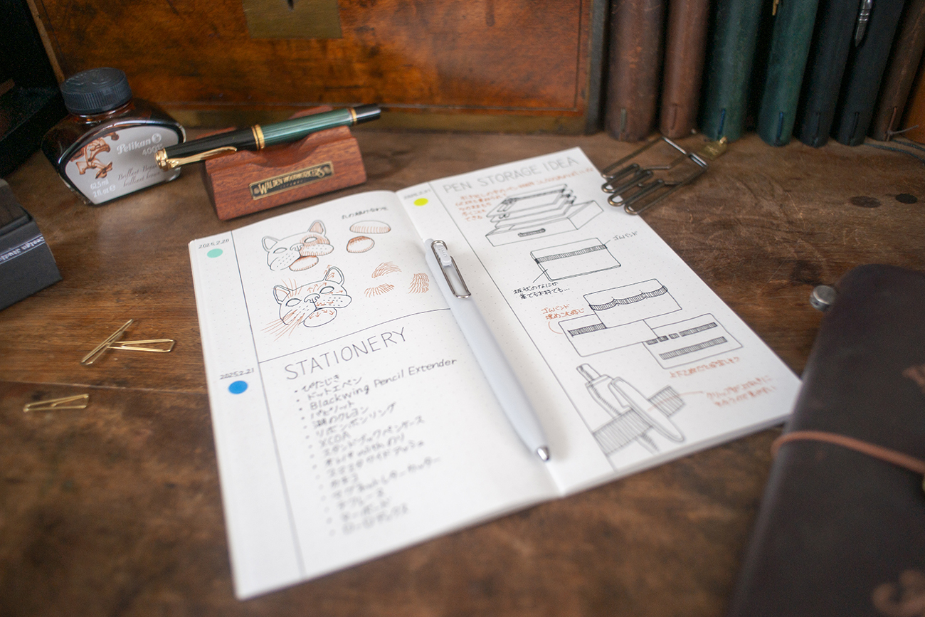 持ち運びやすいノートであれば、アイデアを思いついたときにすぐに書き留められます。そこで私は、デザインフィルの『トラベラーズノート』のA5スリムサイズを使っています。罫線は、自由に書きやすいドット方眼がおすすめ。グリッド線が目立ちにくく、レイアウトにも柔軟に対応できるのが特徴です」