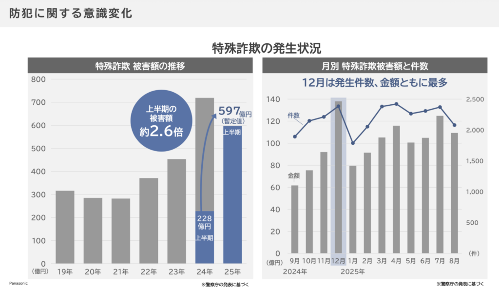 近年、特殊詐欺(オレオレ詐欺、還付金詐欺、架空請求詐欺など)の被害額は増大しており、昨年と今年の上半期と比べるとすでに被害額は2.6倍に……。また月別で特殊詐欺の発生件数・被害額を見ると12月が最も多く、忘年会などのイベントで家をあける時間が増え、日没が早まることが理由だとされています。被害額が拡大した理由、また予防する術はないのでしょうか?