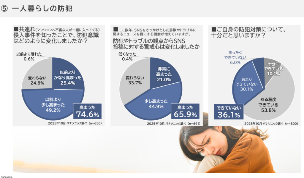 自宅の防犯についても知っておきたいところです。みなさんは「共連れ侵入」という言葉をご存じでしょうか? これは、マンションなどオートロックエントランスのマンションで、住民と一緒に第三者を侵入させてしまい、強盗・窃盗につながるリスクがある行為です。Panasonicの調査によると、実に4人に1人が「共連れ」を経験している結果も。一人暮らしではどのような防犯を行えばいいのでしょうか?