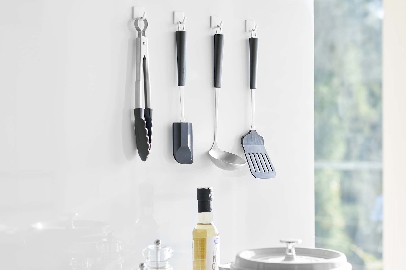 「レンジフードの整流板にマグネットで取り付けられます。毎日使うおたまやフライパン返しなどのキッチンツールを、使うときにサッと手に取ることができます。また、キッチンツールだけでなく、ふきんや鍋つかみ、輪ゴムなど、よく使うものをまとめて収納するのもおすすめ。等間隔に固定して配置されているフックなので、見た目にもすっきりしています」