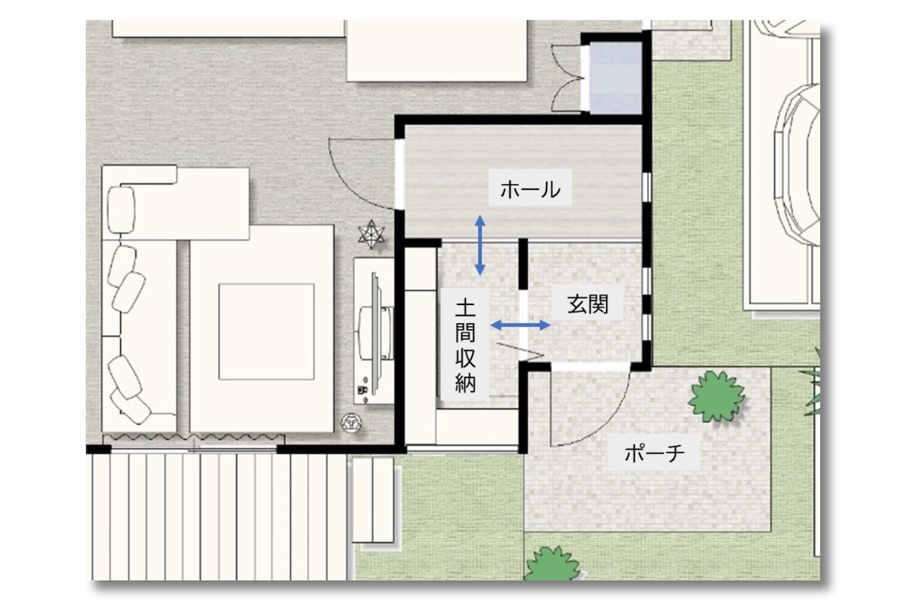 「玄関から入り、土間収納を通ってそのまま玄関ホールに抜けられるタイプです。土間収納で靴を脱いでそのまま室内に入ることができます。土間収納に靴棚をつくることで、玄関で靴を脱ぎっぱなしにすることを防げるので、玄関をきれいな状態に保てます。玄関が散らからないので、急な来客時も安心です。ウォークインタイプと比較すると壁が少なくなるので、その分収納量は減ります」