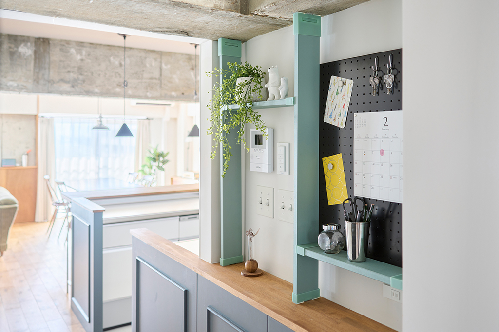 「市販のアジャスターを使えば、本棚を組み立てる感覚で簡単に間仕切りを設置できます。もちろん、壁や床を傷つけないので、退去時に原状回復も可能。次の写真のように有孔ボードを活用すれば、吊るしたり掛けたりと収納方法も広がり、用途に合わせたお部屋づくりを楽しめます」